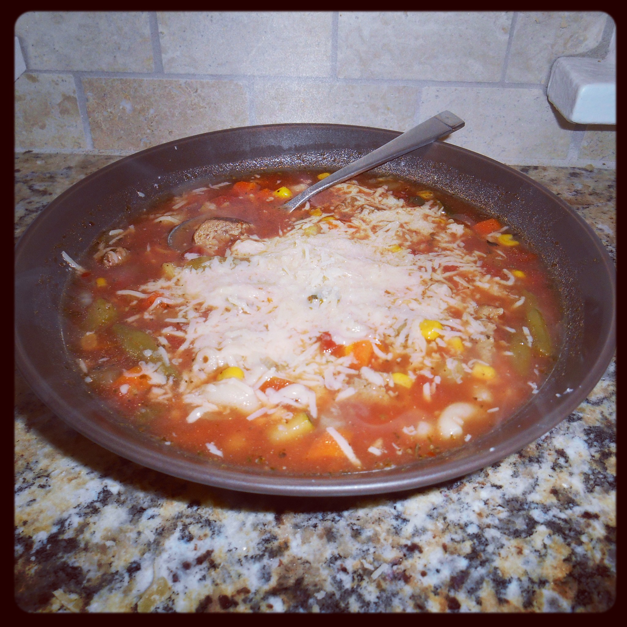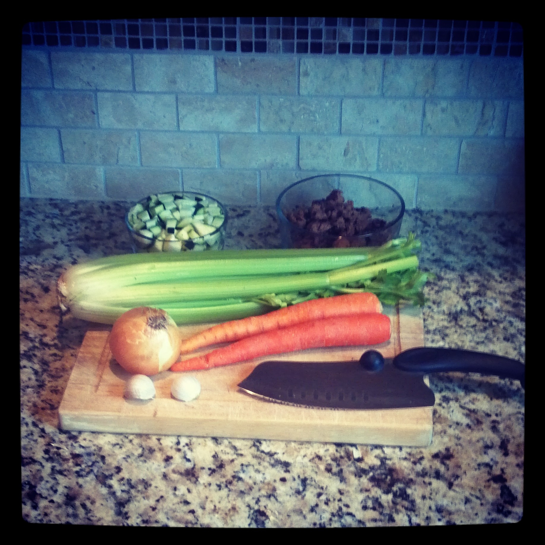 - In a frying pan, brown the sausage breaking up any large pieces until it is fully cooked. Mean while, chop up the onion, carrots, celery, zucchini, and garlic (if you have a garlic press, you can use instead).