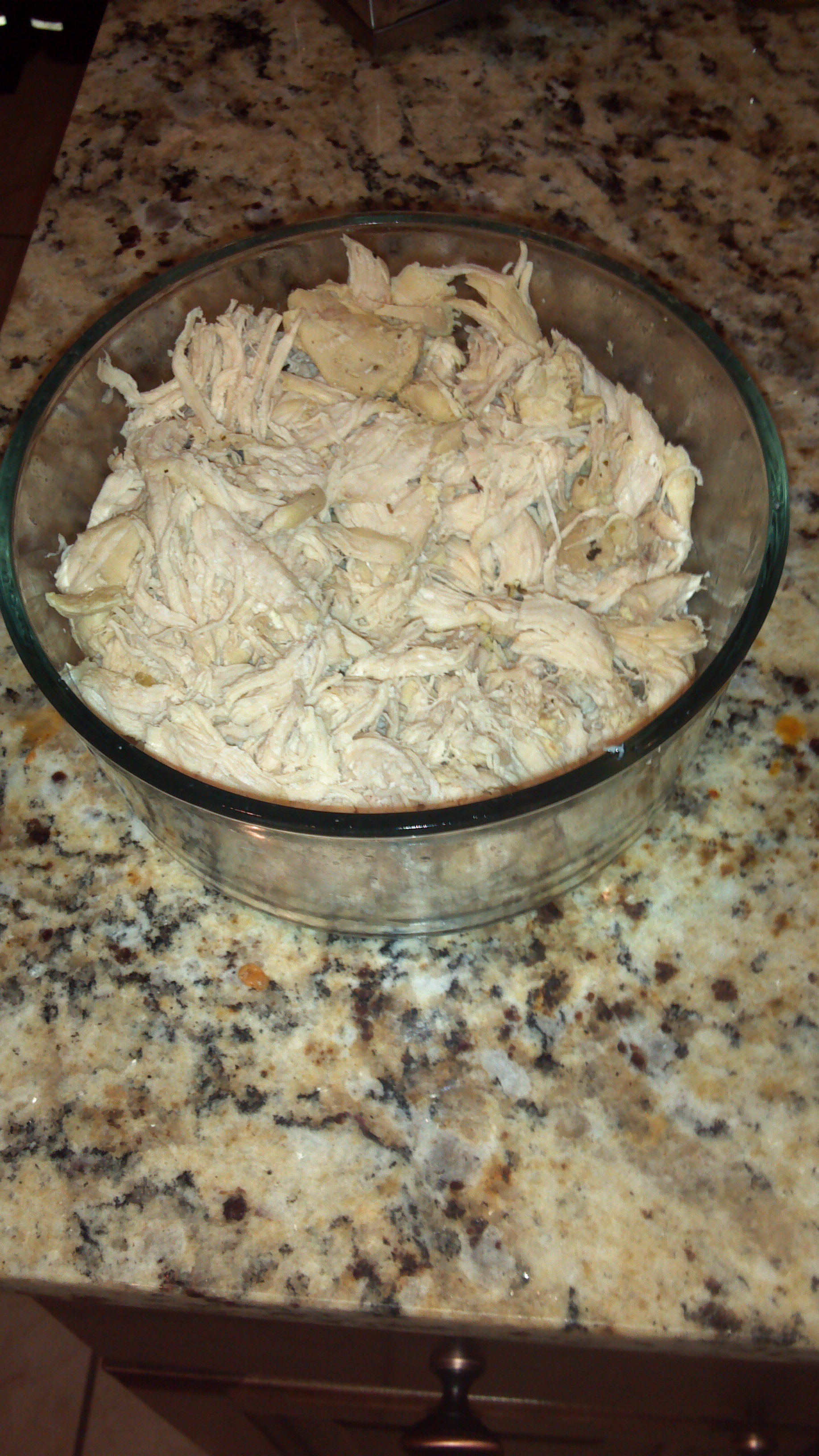 For lunches, I boiled 4 chicken breasts in water along with an array of seasoning (garlic powder, salt, dried herbs, etc) until the chicken was cooked thoroughly and easily shredded (about 30 minutes).  After I let the chicken cool, I shredded it and stored it in a Pyrex bowl for us to have easy access to for salads and lettuce wraps.