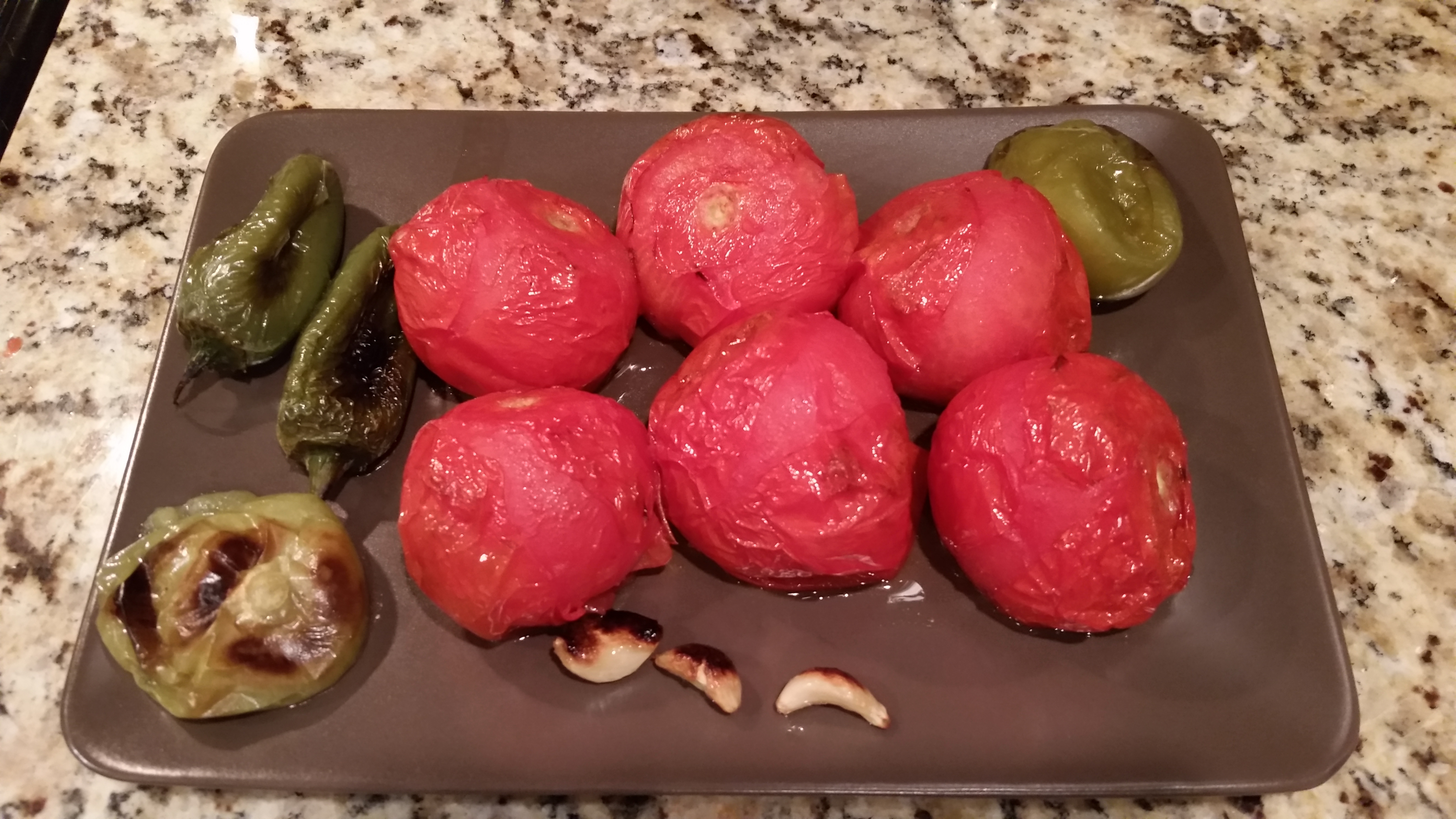 Place the oil coated ingredients onto your cookie sheet, throw it in the oven, and set a timer for 5 minutes. When the time is up, remove the garlic (you don’t want to over roast the garlic!), and continue roasting everything else for 5 more minutes. Carefully turn the tomatoes, tomatillos, and jalepenos with a tong and place back into the oven for an additional 10 minutes.