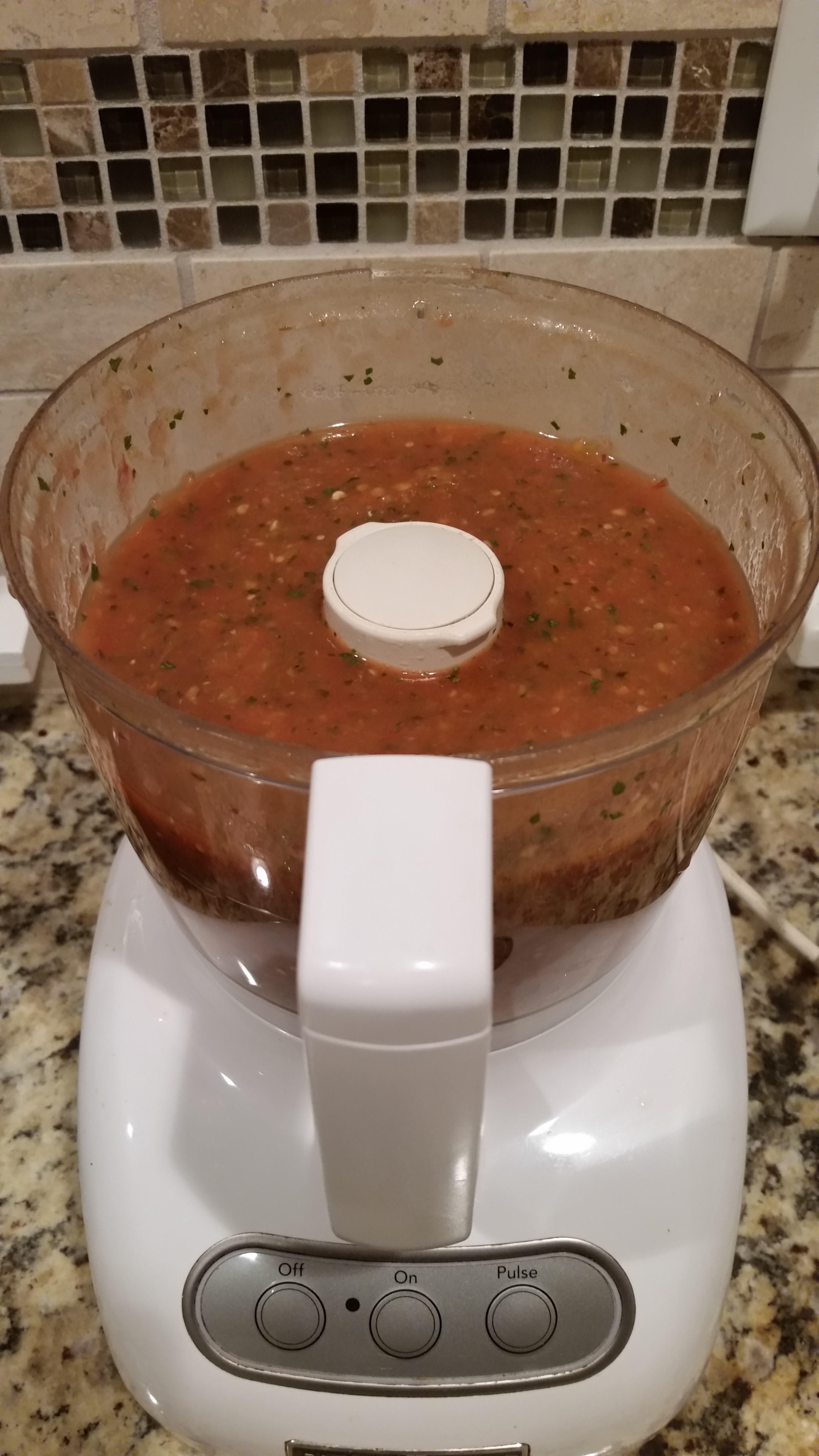 After everything has cooled, place the tomatoes, tomatillos, jalepenos, garlic, 1/2 cup cilantro, 1/4 of an onion (or half if its a small onion), juice from a lime, 1/2 tablespoon of vinager, and 1 teaspoon of salt into a food processor. If you do not have a food processor, a blender should work just fine.