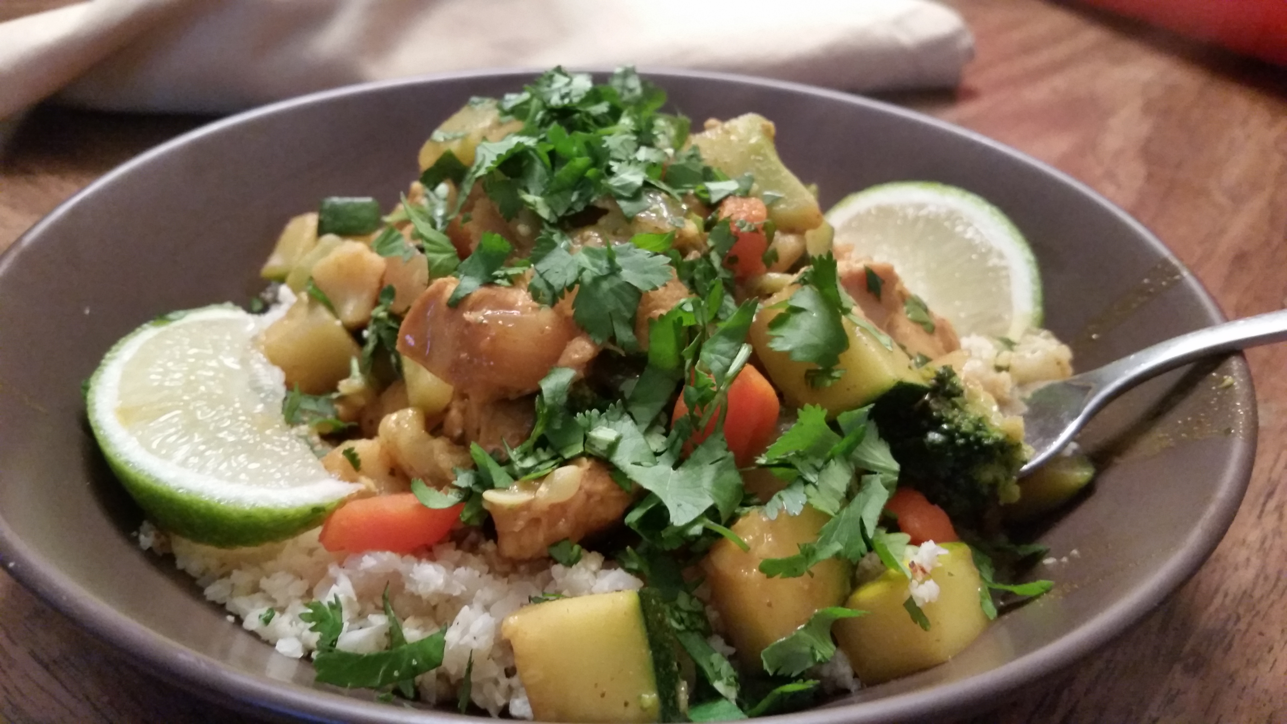 2 thoughts on “Coconut Curry with Cauliflower Rice (Paleo, Vegan options)