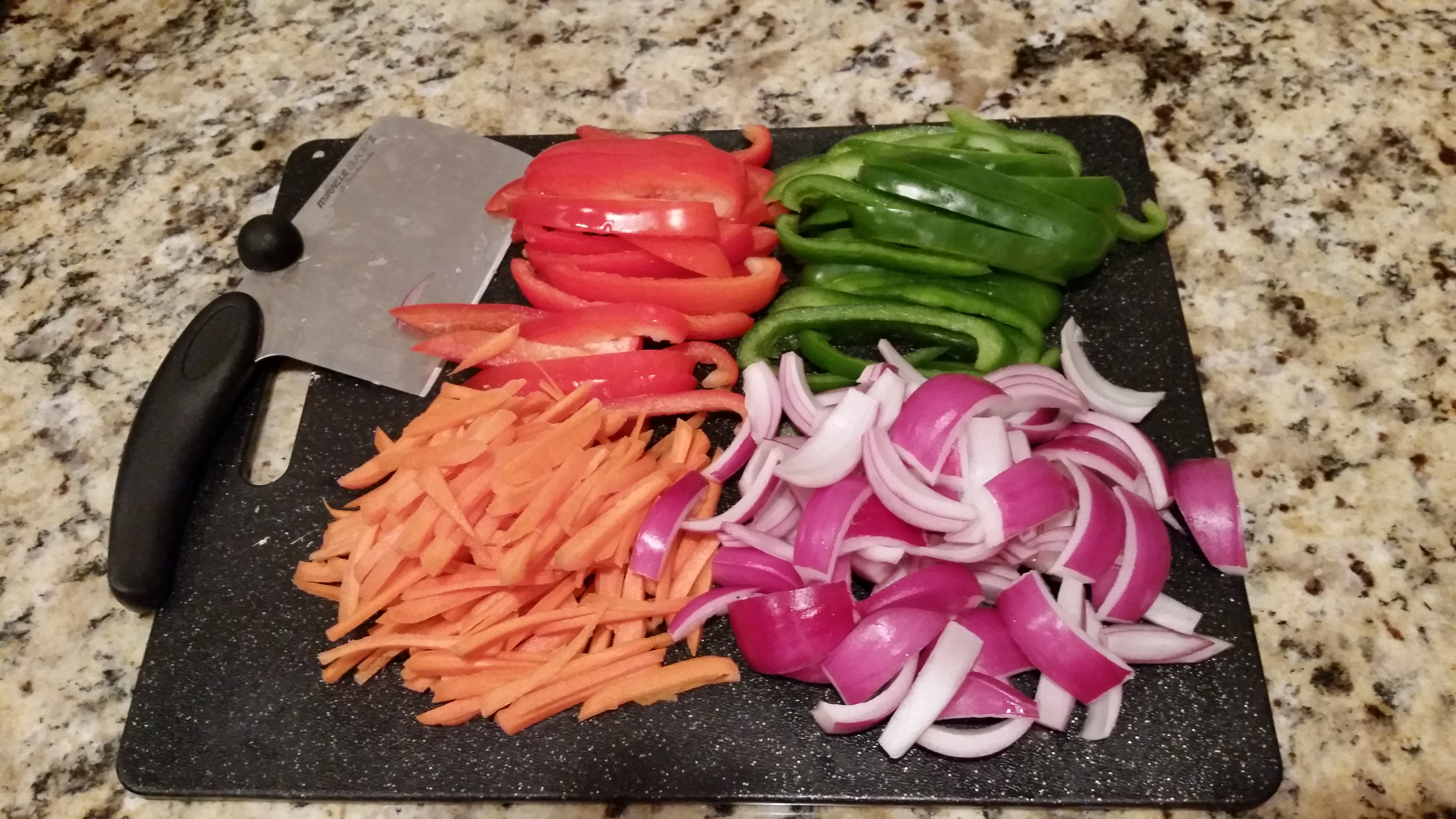 3. Add the additional tablespoon of coconut oil to the pan then add bell peppers, carrots, and onion. Sauté for about 5 minutes. Break up zucchini noodles so they are not too long (I used a knife). Add zucchini noodles to the pan and stir them into the vegetables. Stir and sauté for about 3 minutes. Cover pan for about 3-4 minutes to allow noodles to soften.